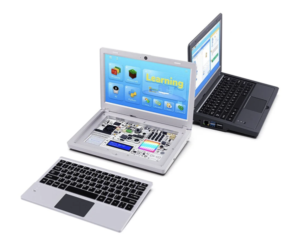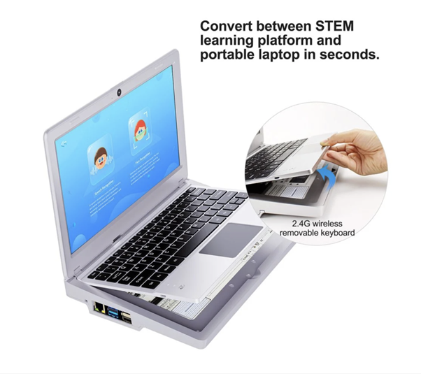 CrowPi2 là nền tảng học STEM/STEAM dạng laptop dựa trên Raspberry Pi, chuyển đổi nhanh giữa chế độ “học & thực hành”. Bàn phím không dây có thể tháo rời để lộ “ 1 development board” bên dưới, nơi tích hợp hệ cảm biến/linh kiện phục vụ học lập trình.