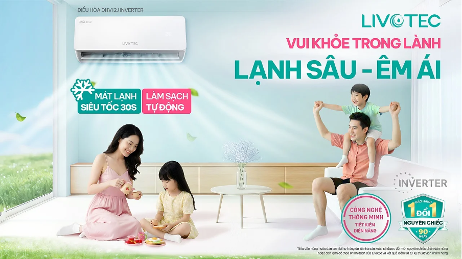 Tâm điểm trong chiến lược năm 2026 của hãng chính là dòng Điều hòa Livotec Inverter DHV-Series. Không chỉ gây ấn tượng bởi thiết kế hiện đại, đa dạng màu sắc phù hợp với mọi không gian sống "trendy", sản phẩm còn sở hữu nhiều công nghệ thông minh. Sự kết hợp giữa máy nén Inverter thế hệ mới và chip IVO 4.0 giúp máy vận hành bền bỉ, duy trì nhiệt độ ổn định ngay cả trong những đợt cao điểm nắng nóng với dải điện áp rộng. Đặc biệt, chế độ i-Boost cho phép làm lạnh tức thì chỉ sau 30 giây, mang lại sự thư thái ngay khi bước chân vào nhà. Đặc biệt, để minh chứng cho chất lượng sản phẩm, Livotec áp dụng chính sách bảo hành rất độc đáo và ấn tượng: Lấy người tiêu dùng làm trọng tâm: 1 đổi 1 nguyên chiếc (phần dàn nóng hoặc dàn lạnh) trong vòng 90 ngày đầu nếu phát sinh lỗi từ nhà sản xuất.