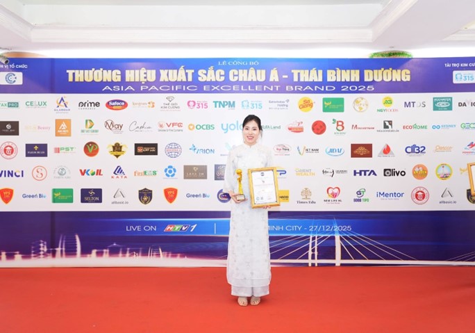 Đại diện thương hiệu nhận cúp vàng và chứng nhận Top 10 Thương hiệu xuất sắc Châu Á – Thái Bình Dương 2025