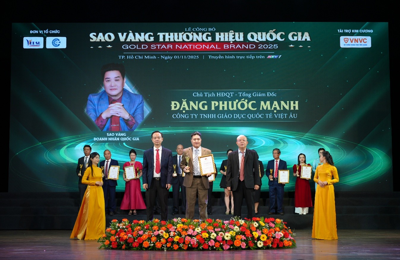 Ngày 1/11/2025, tại Nhà hát Bến Thành (TP. Hồ Chí Minh), chương trình “Sao Vàng Thương Hiệu Quốc Gia 2025” do Viện Nghiên cứu Kinh tế Châu Á, Liên hiệp Khoa học Phát triển Doanh nghiệp Việt Nam và Đài Truyền hình TP. HCM phối hợp tổ chức đã diễn ra trong bầu không khí trang trọng. Sự kiện vinh danh những doanh nhân, doanh nghiệp có đóng góp tiêu biểu trong công cuộc phát triển kinh tế, nâng tầm vị thế thương hiệu Việt trên trường quốc tế. Trong buổi lễ, thầy Đặng Phước Mạnh – Chủ tịch HĐQT - Tổng Giám đốc Công ty TNHH Giáo dục Quốc tế Việt Âu đã được xướng tên trong hạng mục danh giá “Sao Vàng Doanh Nhân Quốc Gia 2025”, ghi dấu cột mốc quan trọng trong sự nghiệp hơn hai thập kỷ gắn bó với ngành giáo dục và phát triển nguồn nhân lực quốc tế.