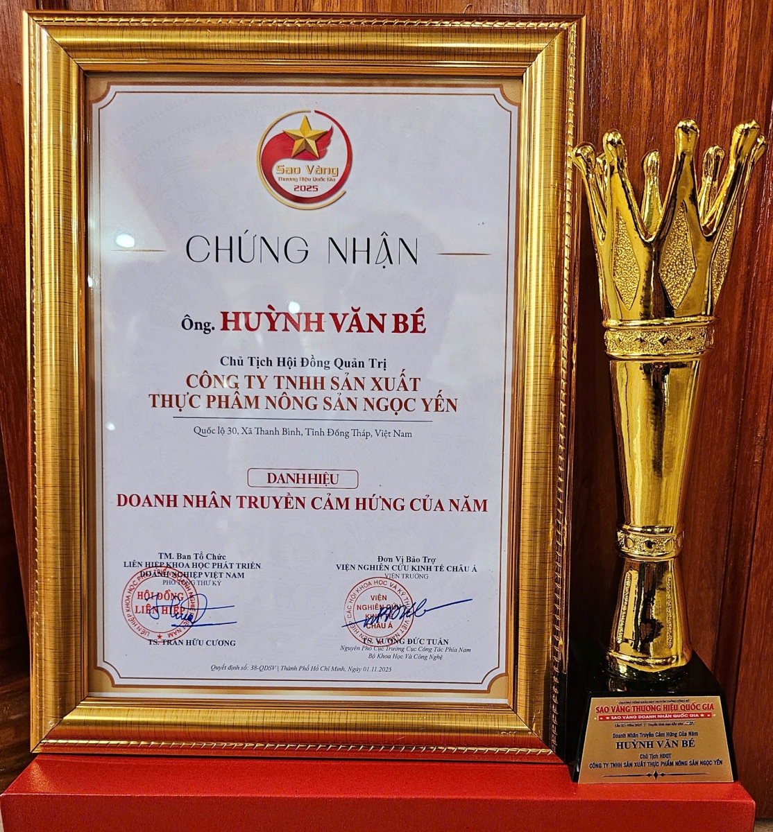Với những đóng góp bền bỉ và tinh thần cống hiến không ngừng, ông Huỳnh Văn Bé đã được vinh danh “Doanh nhân Truyền cảm hứng của năm” – một giải thưởng ghi nhận những cá nhân tiên phong, sáng tạo, lan tỏa giá trị tích cực đến cộng đồng và xã hội.